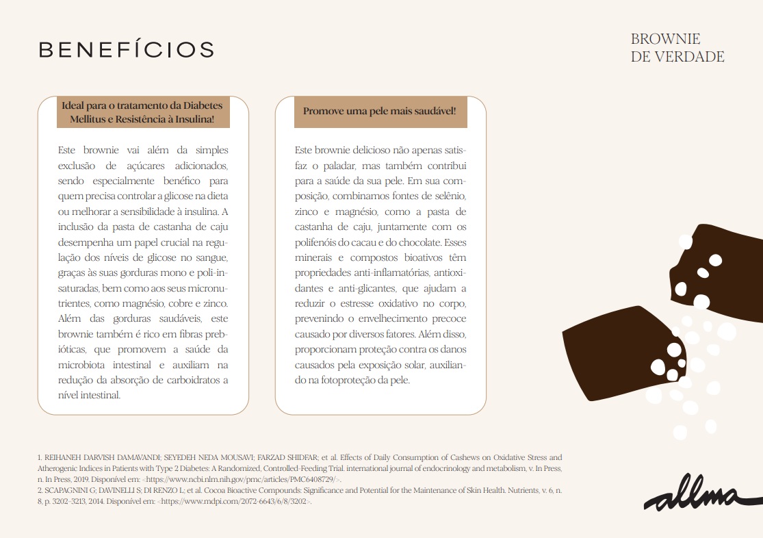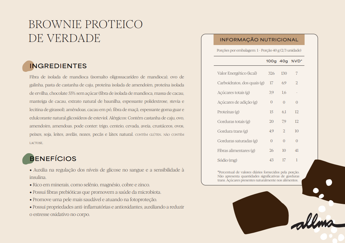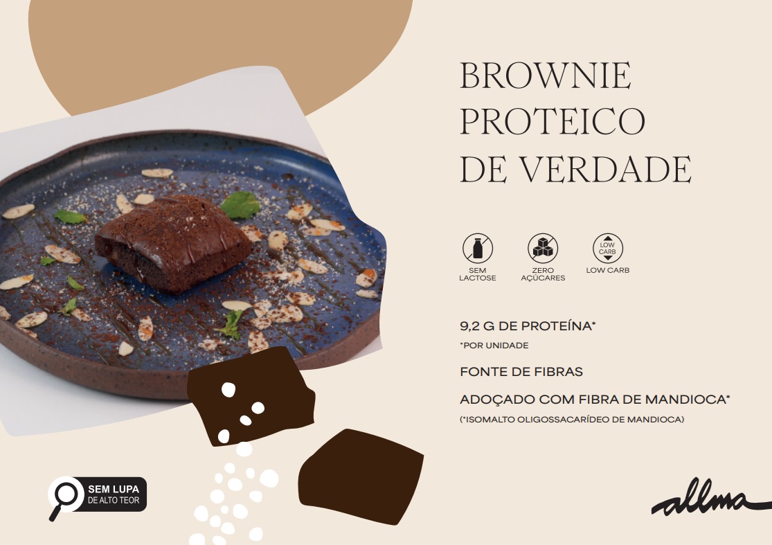 Brownie Low Carb, adoçado com fibra de mandioca e zero lactose. Ajuda no tratamento de diabetes mellitus e resistĂȘncia Ă insulina, alĂ©m de promover uma pele mais saudĂĄvel. Nosso Brownie tem 25% de fibras, 17% de carboidratos e 14% de proteĂnas.