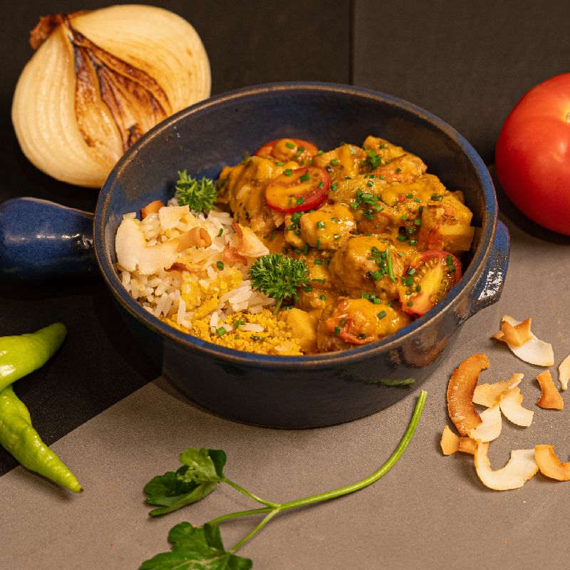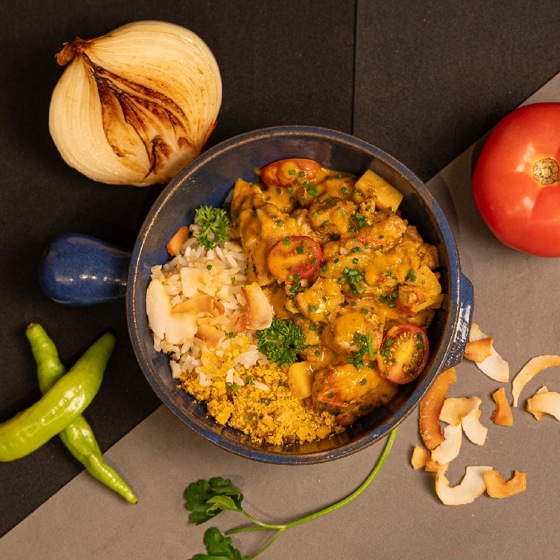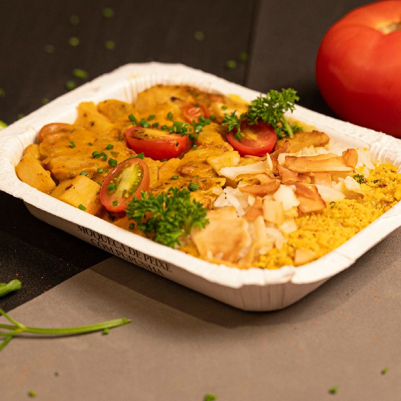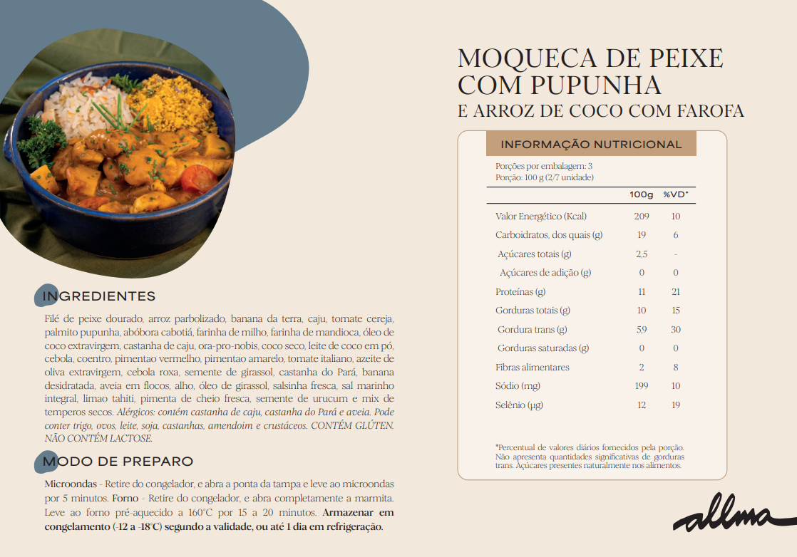 Filé de peixe dourado, arroz parbolizado, banana da terra, caju, tomate cereja, palmito pupunha, abóbora cabotiå, farinha de milho, farinha de mandioca, óleo de coco extravirgem, castanha de caju, ora-pro-nobis, coco seco, leite de coco em pó, cebola, coentro, pimentao vermelho, pimentao amarelo, tomate italiano, azeite de oliva extravirgem, cebola roxa, semente de girassol, castanha do Parå, banana desidratada, aveia em flocos, alho, óleo de girassol, salsinha fresca, sal marinho integral, limao tahiti, pimenta de cheio fresca, semente de urucum e mix de temperos secos.