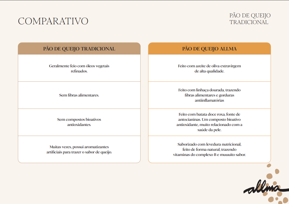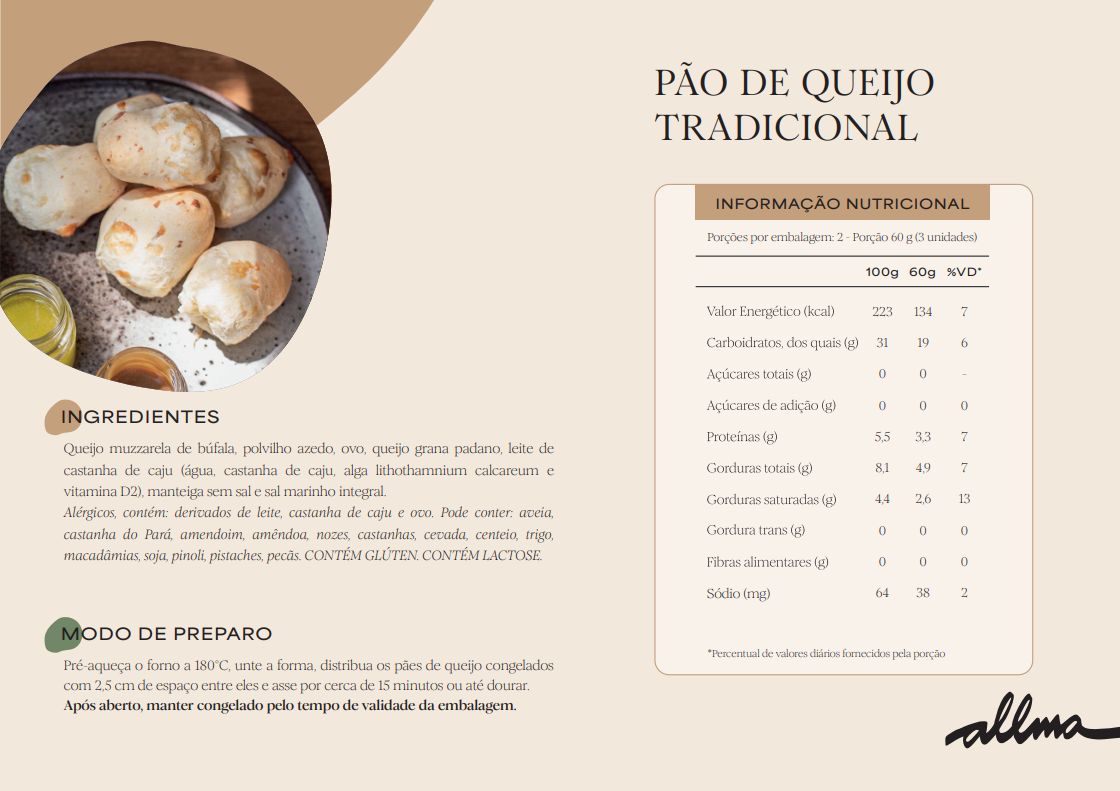 Queijo muçarela de búfala, polvilho azedo, ovo, queijo grana padano, leite de castanha de caju (água, castanha de caju, alga lithothamnium calcareum e
