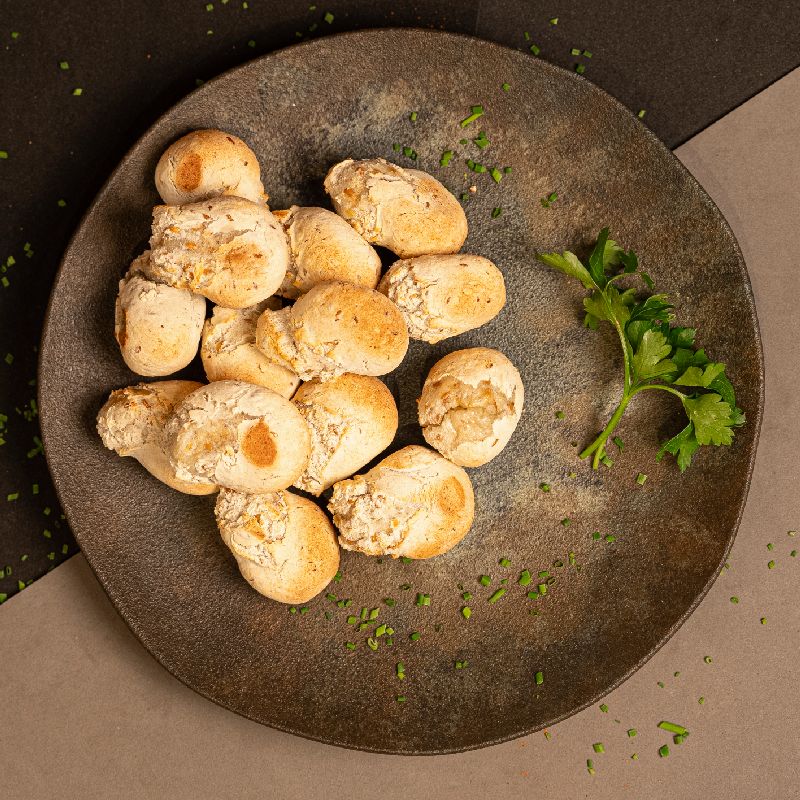 Queijo muçarela de búfala, polvilho azedo, ovo, queijo grana padano, leite de castanha de caju (água, castanha de caju, alga lithothamnium calcareum e